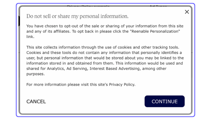 The visitor can close the pop-up and continue onto the site, and the link will change to “You have successfully opted out. Please click here if you would like to reenable personalization.” If clicked, this link will opt the user back in. This process and standard language are required across the internet.
