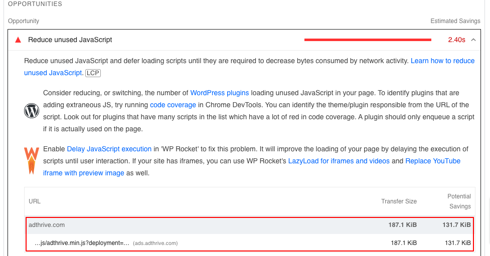 - Raptive ad scripts may appear as “render-blocking” or “unused JavaScript.”