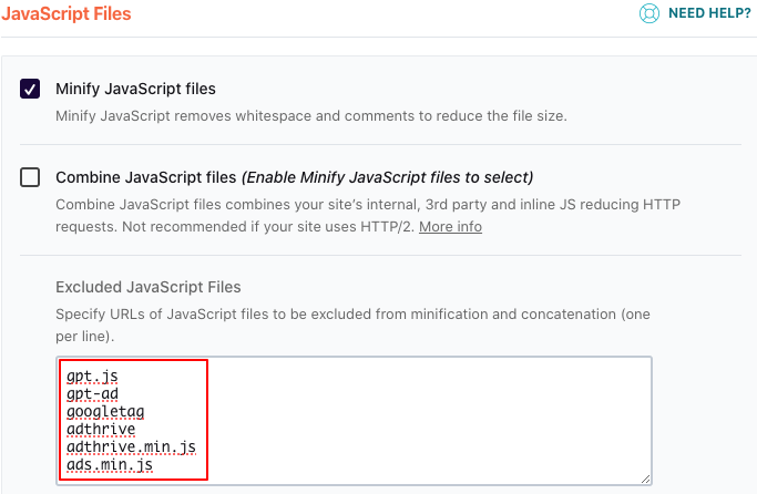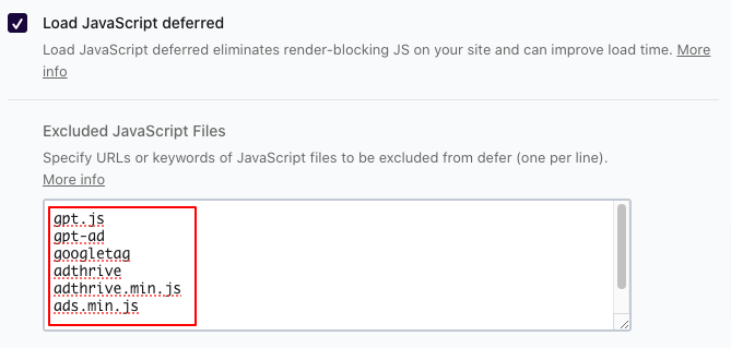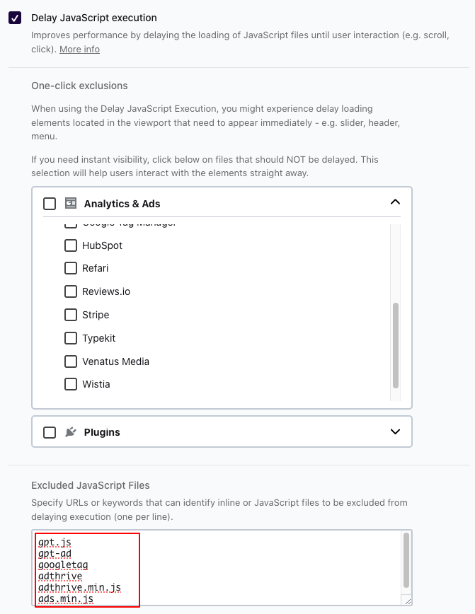 4. If you have the Minify JavaScript files, Load JavaScript deferred and Delay JavaScript execution settings enabled, paste the exclusion lines from Step 3 in the Excluded JavaScript Files box located under these settings as follows: